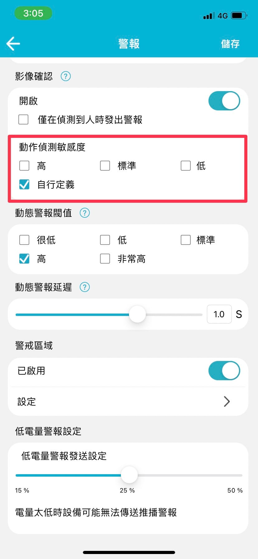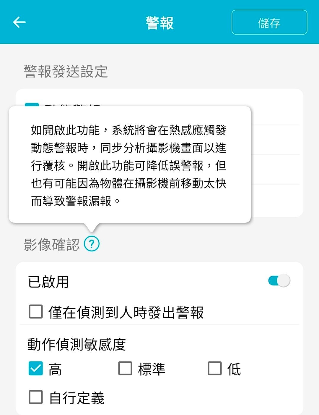 假設攝影機放置在像農田的位置,比較多動物出沒,但你只想偵測人的話,可以打開<僅在偵測到人的時候發警報>這項設定,並且可以進一步的設定靈敏度<高、標準、低、自行定義>。