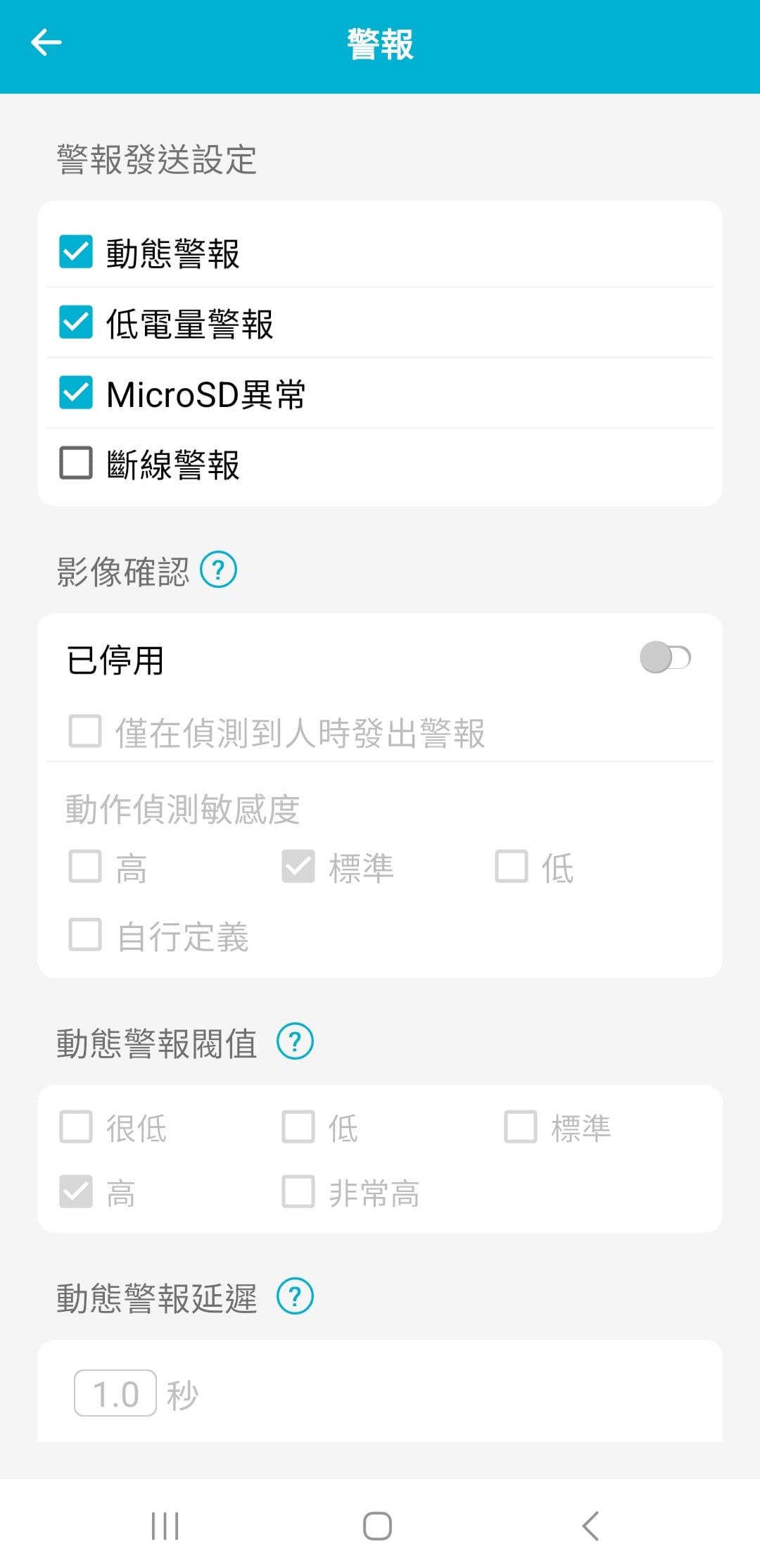 細項的設定還有影像確認、動態警報閥值、動態警報延遲。