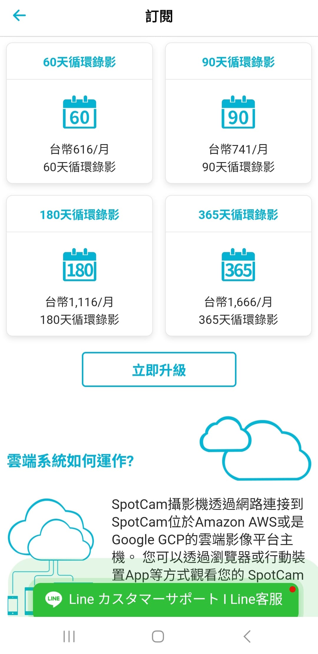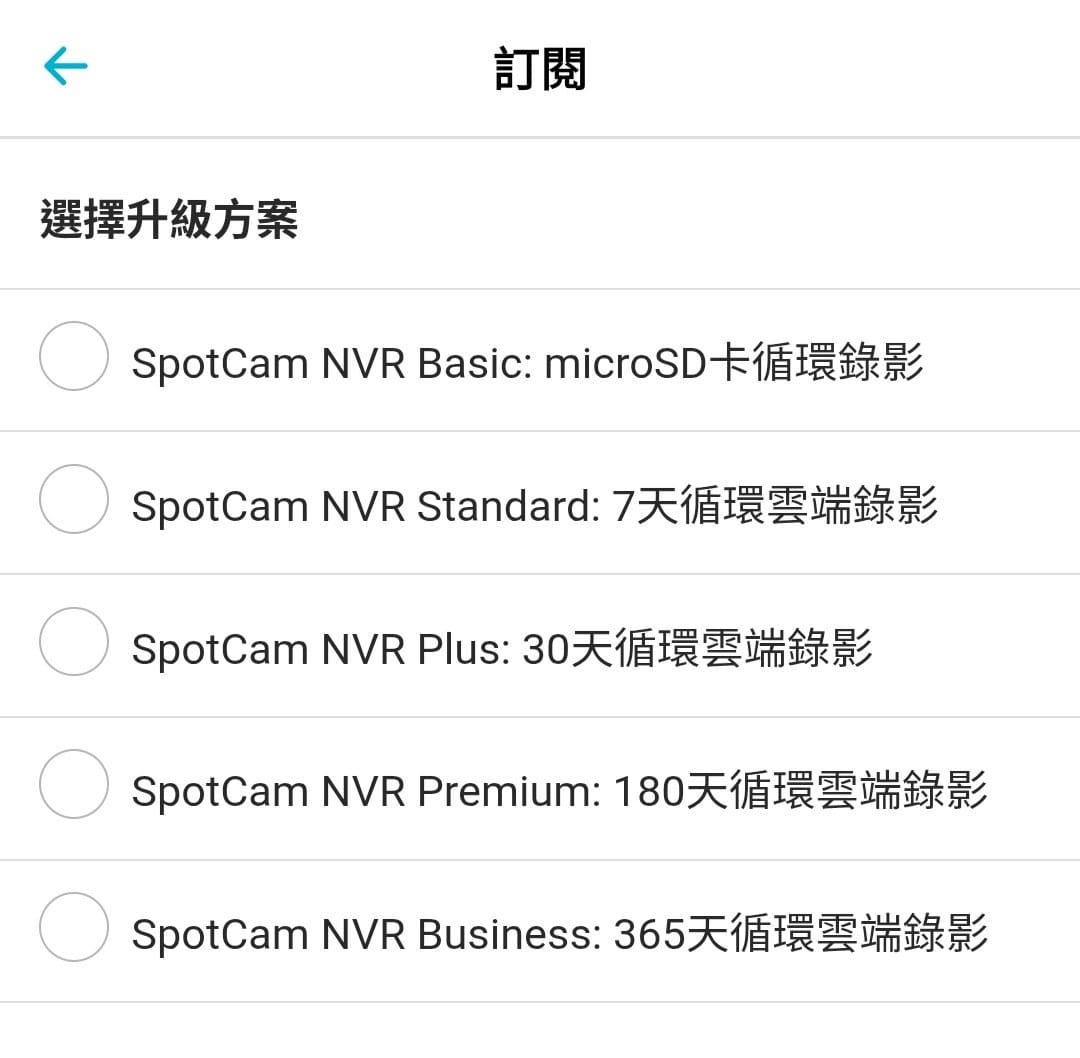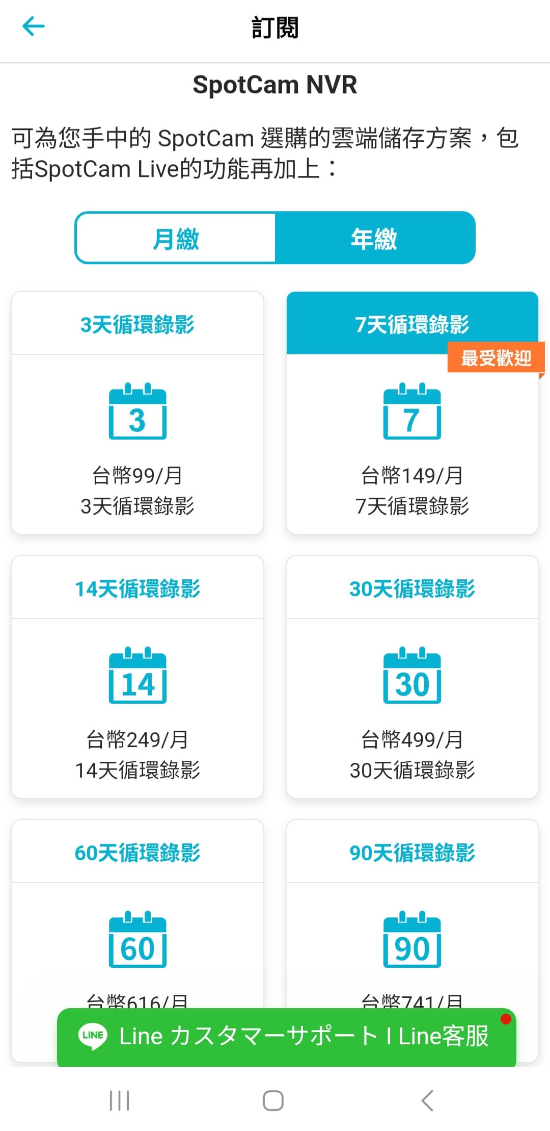 如果覺得免費的七天雲端儲存不夠用的話,也可以選擇其他的升級方案。付費方式可以選擇月繳或是年繳,選擇年繳有兩個月的免費折扣。