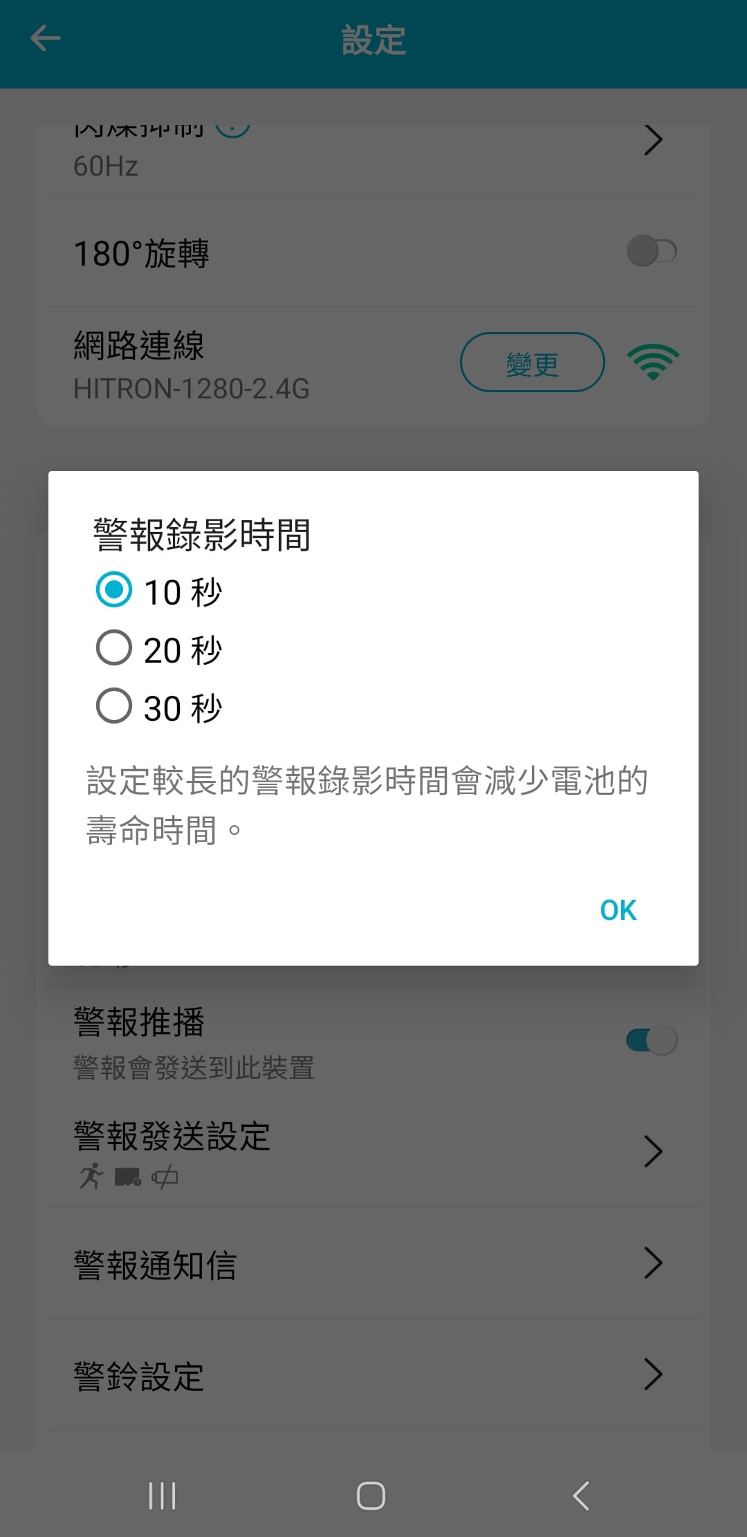 警報錄影時間: 有10秒、20秒、30秒,三種時長設定。