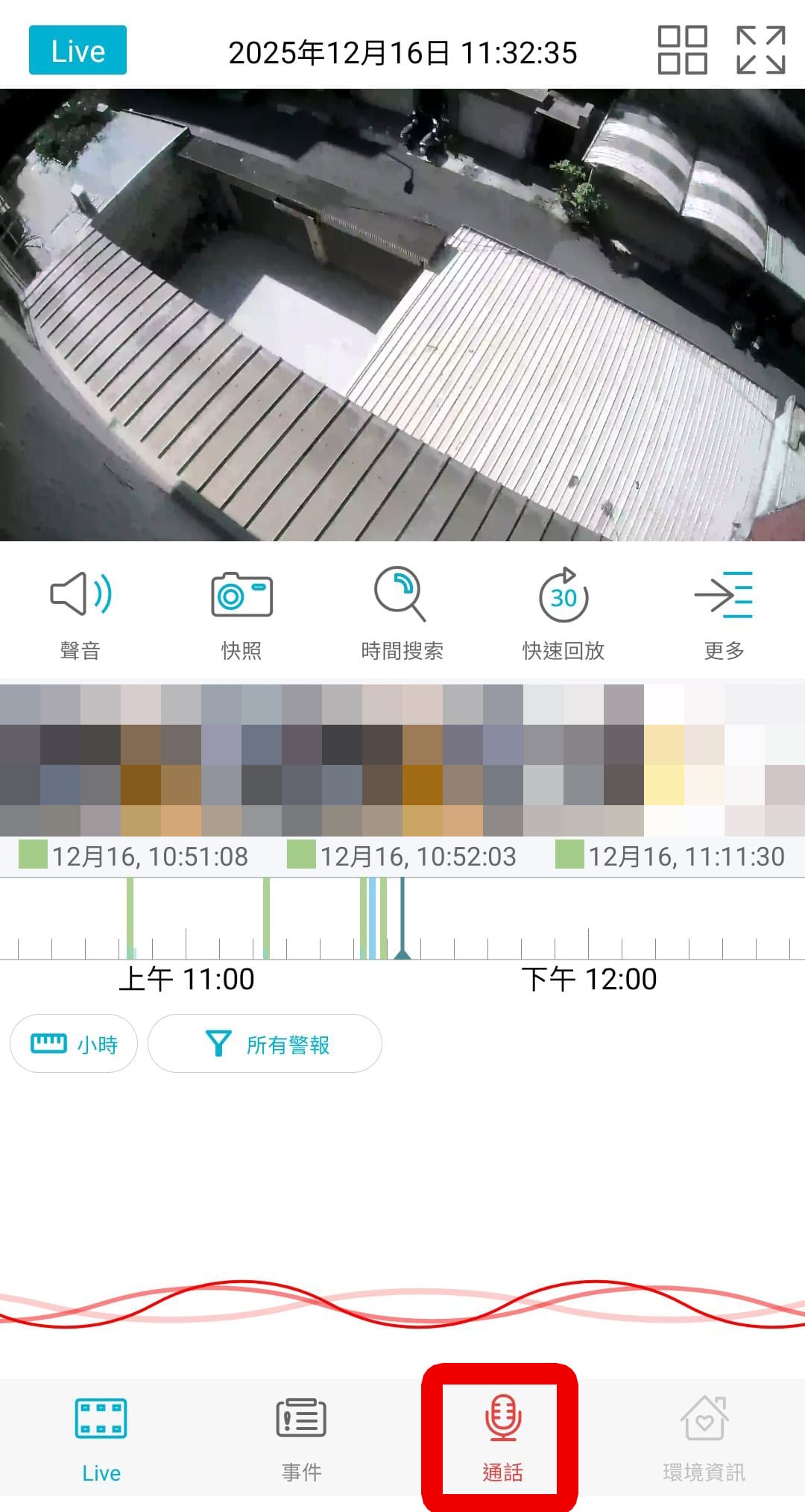 SpotCam Solo Eco 攝影機,有一項我覺得滿不錯的功能就是<雙向語音>。按下APP裡的通話鍵就可以在手機端這邊講話,傳送到攝影機端,攝影機有麥克風跟喇叭所以可以雙向通話。