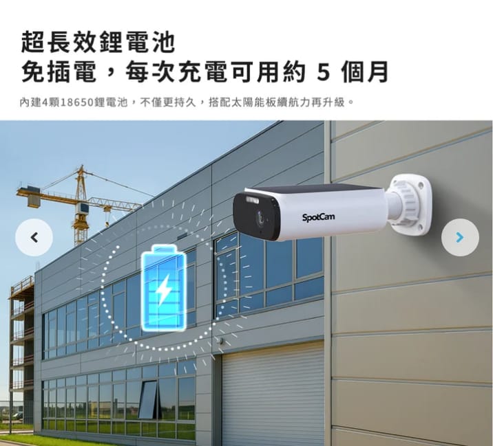 而 SpotCam 也有像 Solo 3 這類以電池為主的款式,本體沒有內建太陽能板,電池容量相對較小(5200mAh),但機身配置更單純。如果需要,也可以另外搭配外接太陽能板使用,供電方式彈性比較高,適合半戶外、屋簷下,或本來就方便定期充電的安裝環境。