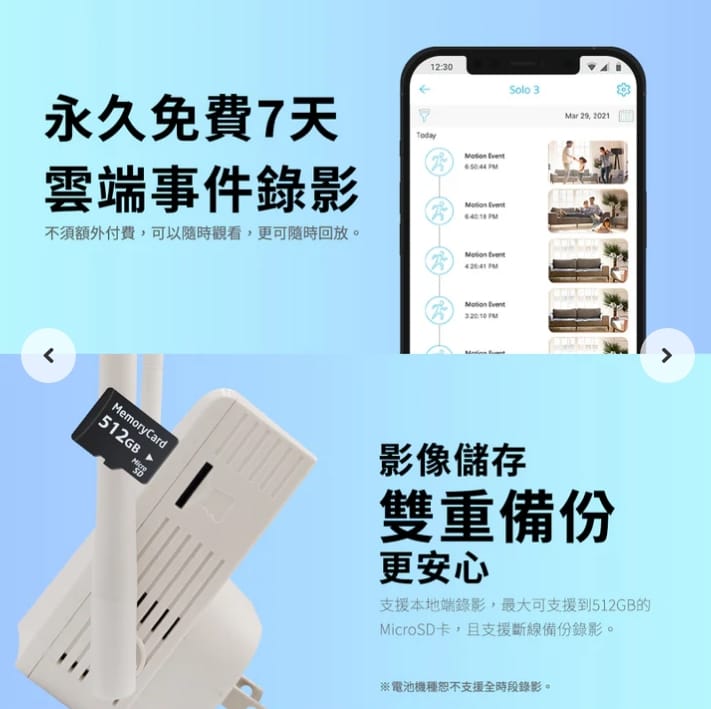 一般監視器要雲端錄影通常都要另外付費,但這台有支援永久免費 7 天事件雲端保存,有偵測到事件才會上傳,不需要自己買記憶卡,手機也能直接看回放。