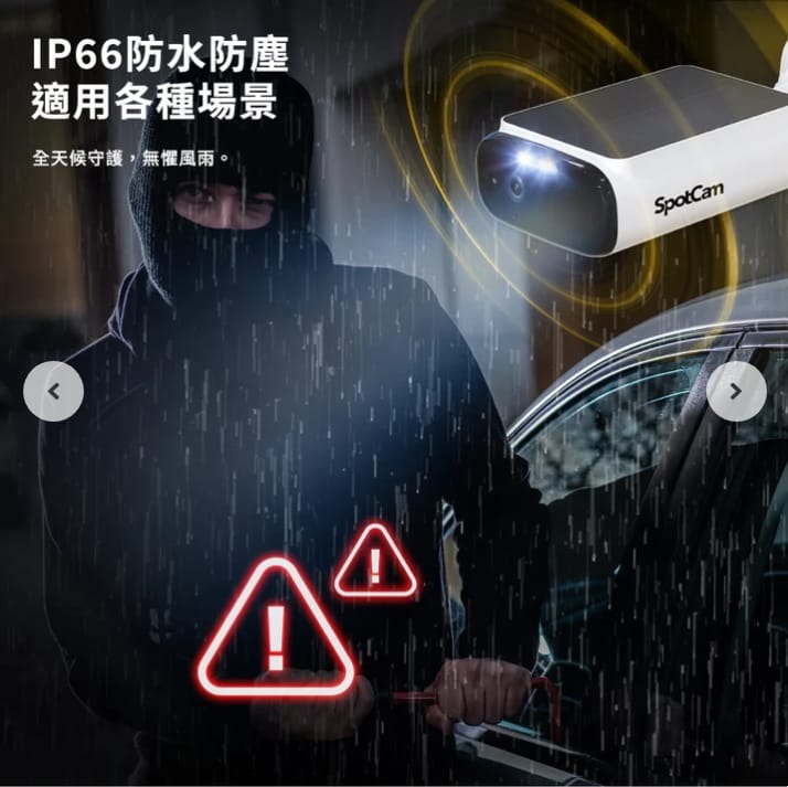 如果你想在家裡門口、騎樓、陽台那種地方沒有插座,又不能拉線、不能鑽孔、還要承受風吹雨淋......的地方裝監視攝影機,我想這台 SpotCam Solo Eco 我覺得它真的把“戶外環境最容易出問題的地方”全部補起來了,下面我把它的核心特色整理給你,每一項都剛好對應一個戶外痛點,完全是為戶外而生的一台攝影機。