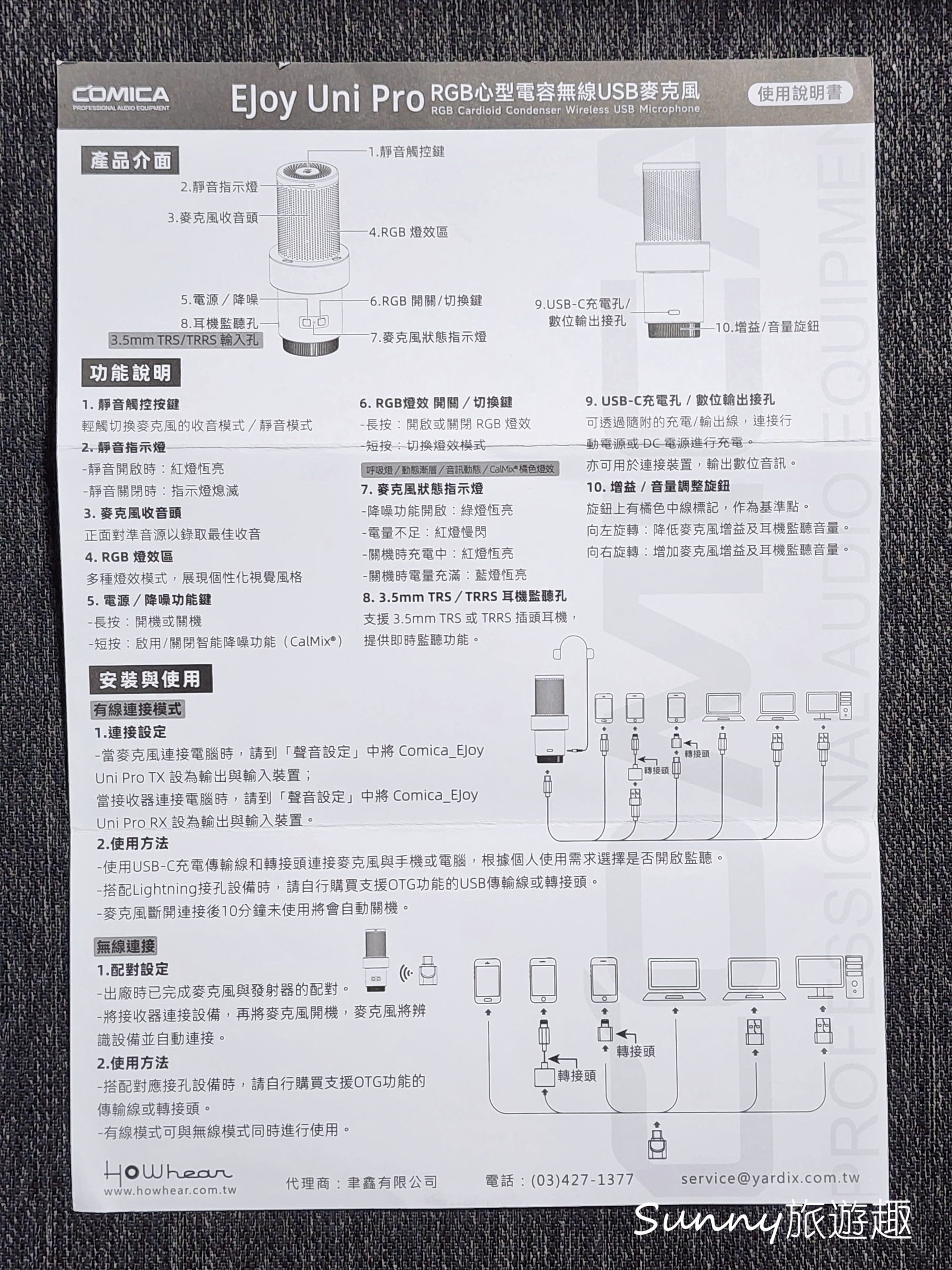 而COMICA -EJoy Uni Pro USB電容式無線麥克風的說明書,就一大張正反兩面,排版跟說明都滿容易懂!字體大小也適中,那些有線、無線的各種連接方式、轉接方式,他們都圖示得很清楚👍