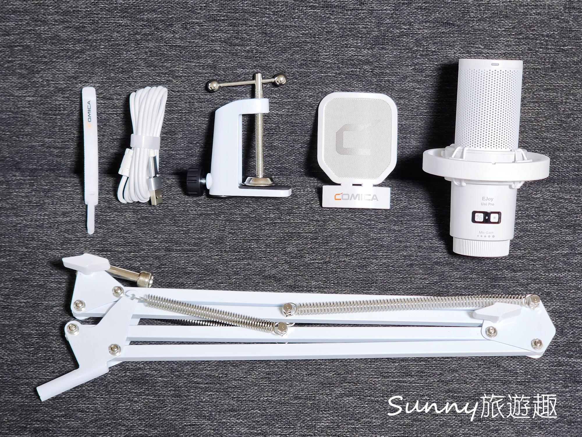 配件總共有:麥克風、接收器、防噴罩、USB-C充電線、USB-C轉接頭-A、懸臂支架、魔術貼(收納線材使用)、說明書。